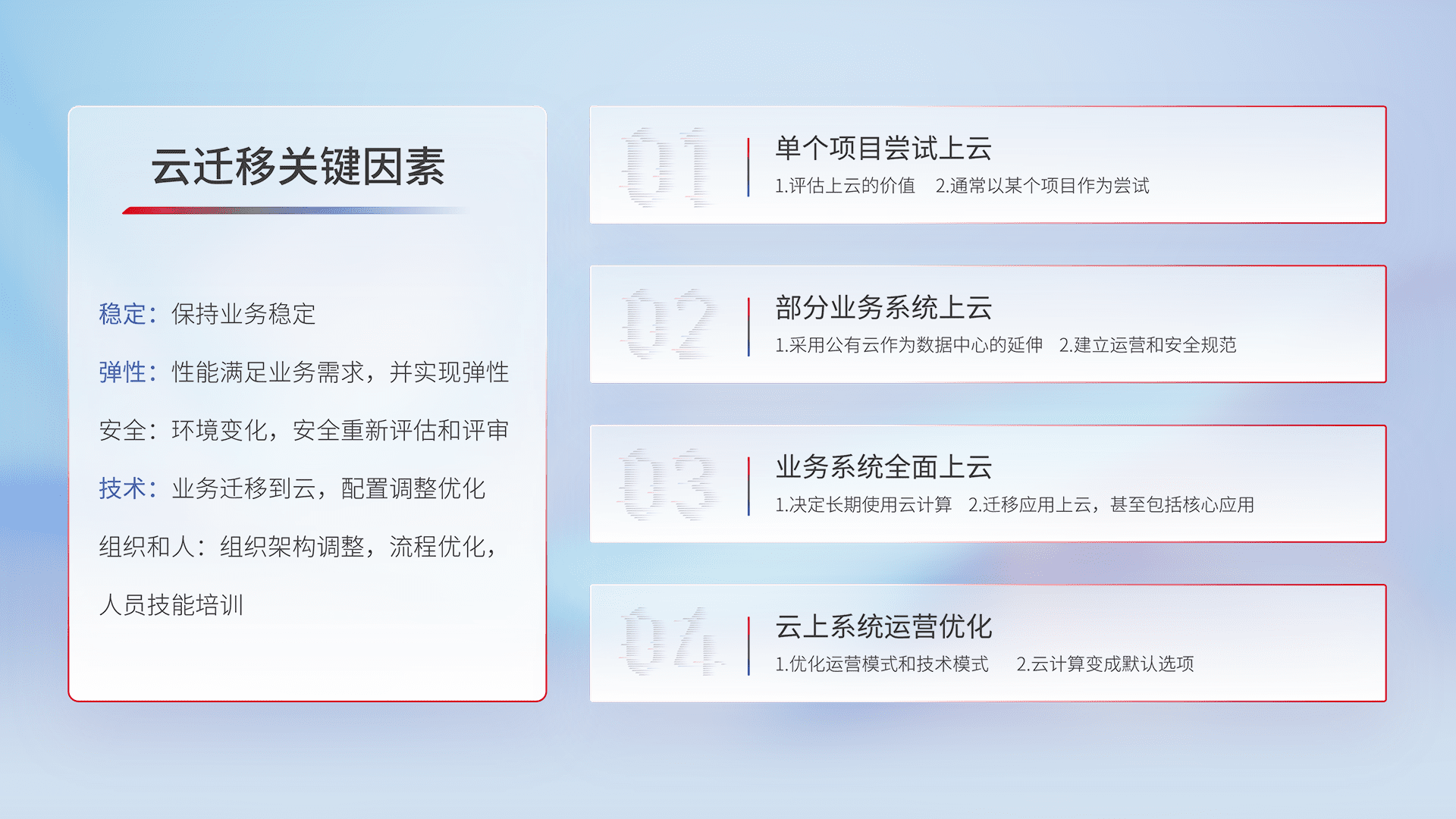 结合实际业务,,,从规划设计、、云平台选型、、、云原生改造、、、、数据迁移、、集成交付,,迁移全过程为客户识别最佳上云路径,,做好风险识别管理,,,,设计网络架构、、身份权限、、安全审计合规、、、操作审计、、日志审计、、监控告警策略、、、、多站点容灾设计等,,,对云上基础设施进行整体规划,,,,提升IT治理水平,,,以满足弹性、、、高可用、、高性能的需求。。
