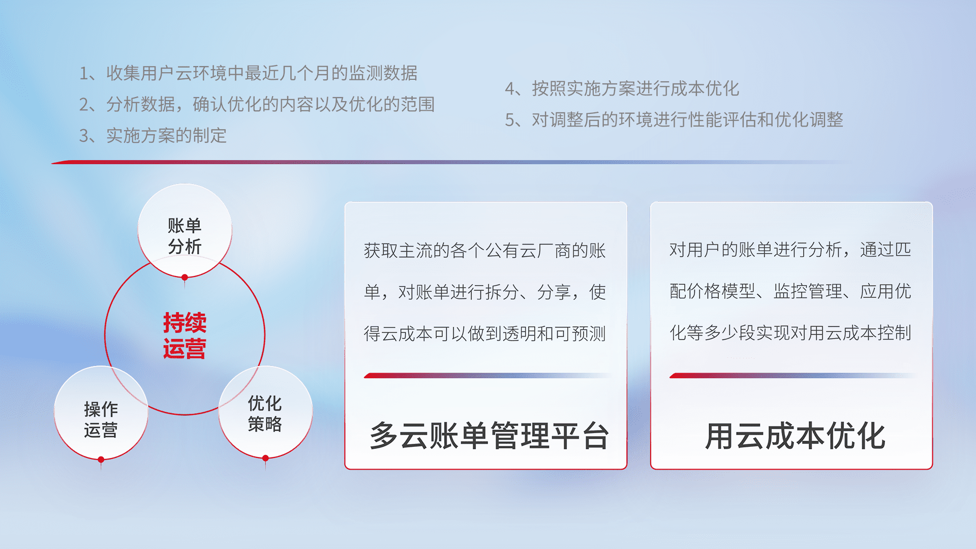 通过多云纳管,,以统一的资源数据模型把客户的云资源进行抽象和封装,,,进而实现对多云资源的统一操作,,,,保障云资源管理的可靠性、、、、稳定性与可用性。。。。量身定制化运维内容,,,配置、、开发运维、、、补丁管理、、备份、、监控、、、认证和访问管理、、、、审计和日常巡检等,,保障在用云过程中的可靠度,,稳定度以及高可用率。。。。